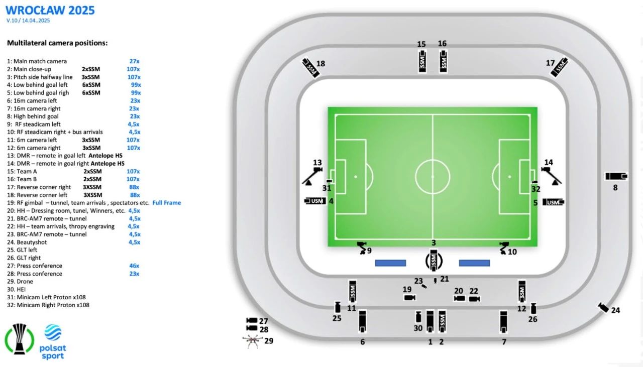 3-固定机位中有8台超级慢动作摄像机(SSM)和2台高速摄像机(HS)。