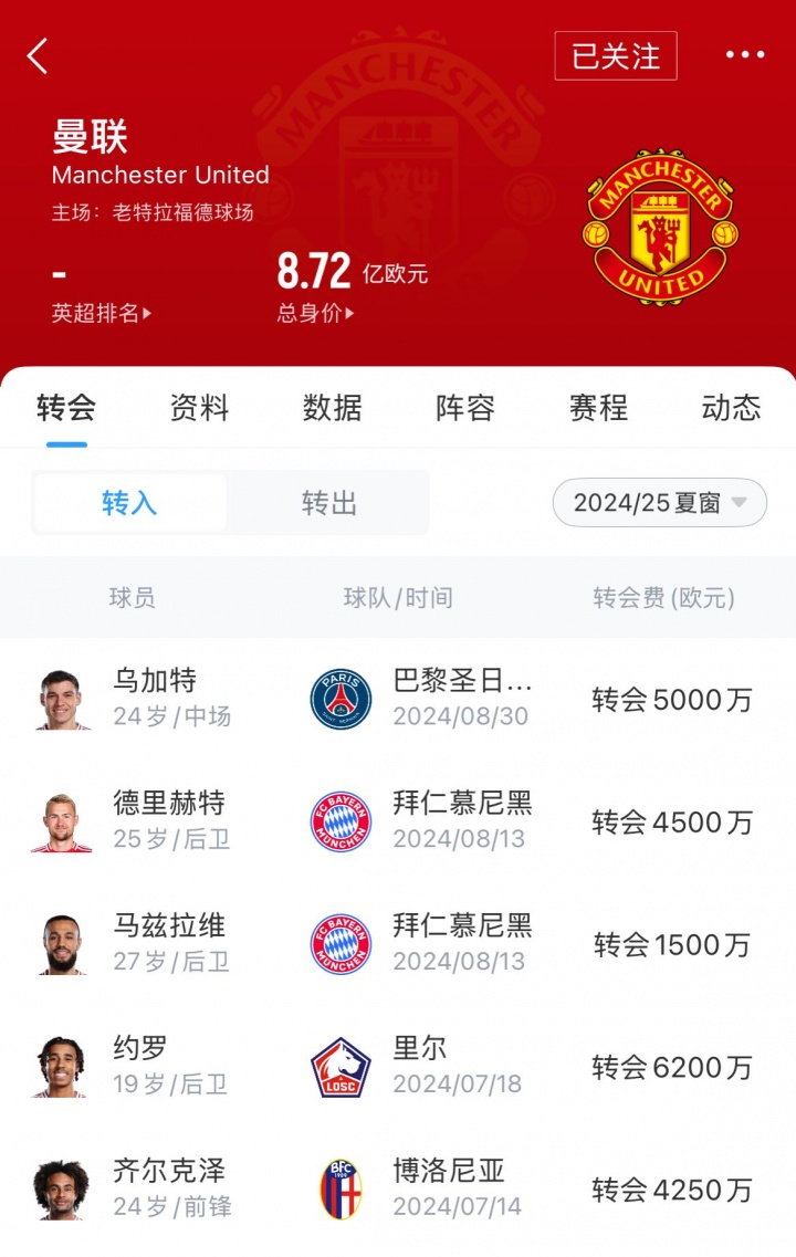 去年夏窗,曼联6200万欧从里尔抢下约罗,5000万欧引进乌加特,4500万欧签德里赫特,4250万欧签齐尔克泽,总支出超过2亿欧元。