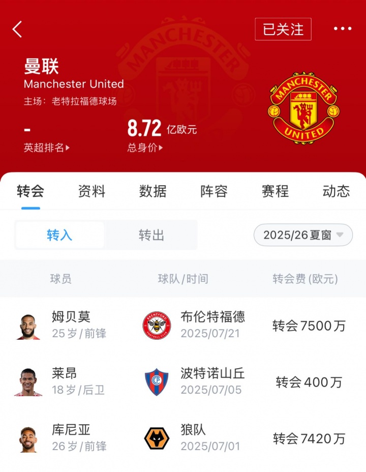 夏窗截至目前,曼联已经支出超1.5亿欧,分别从狼队和布伦特福德签下库尼亚和姆贝莫,两人在英超均有多年的效力经验。对比过去几年的夏窗,曼联似乎摒弃了从其他联赛豪购年轻潜力球员的转会策略。