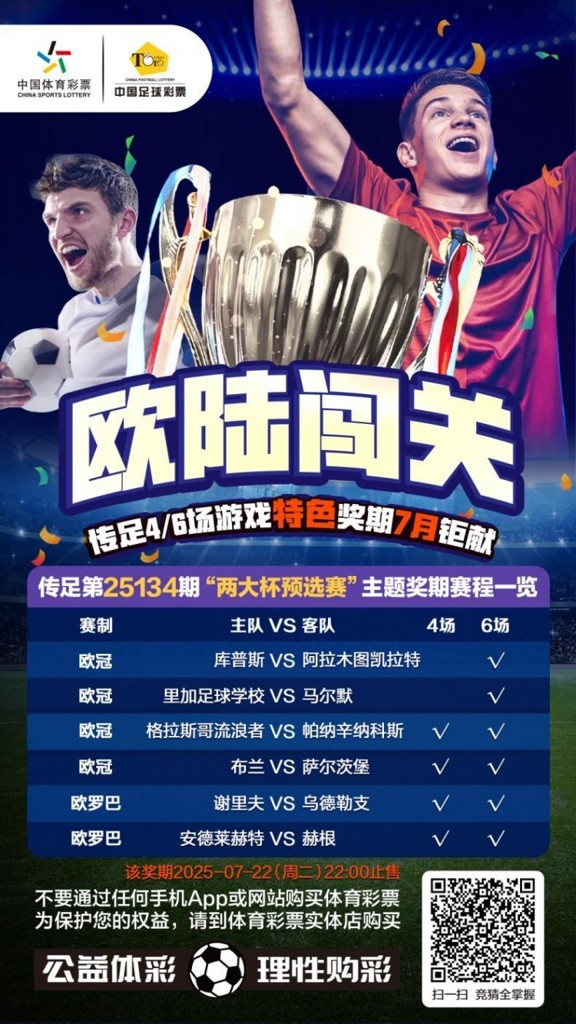 传足4/6场游戏特色奖期第25134期竞猜对象是欧冠和欧罗巴联赛的预选赛。具体对阵:欧冠联赛的库普斯VS阿拉木图凯拉特、里加足球学校VS马尔默、格拉斯哥流浪者VS帕纳辛纳科斯、布兰VS萨尔茨堡,欧罗巴联赛的谢里夫VS乌德勒支和安德莱赫特VS赫根。