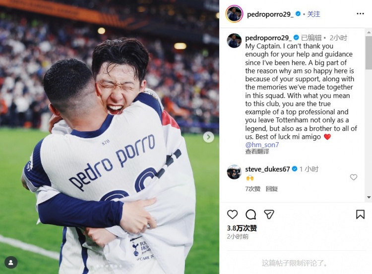 8月4日讯 热刺队长孙兴慜确定离队,预计将前往美职联加盟洛杉矶FC。对于这样的球队传奇离开,热刺后卫波罗在社交媒体上进行了告别。