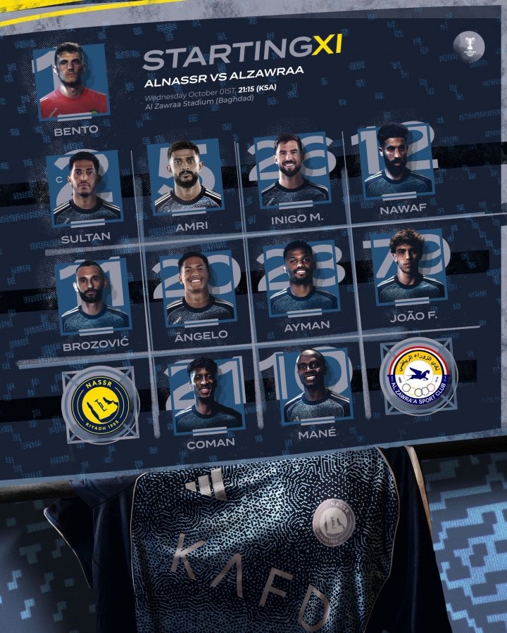 10月2日讯 北京时间凌晨2点15分,亚冠二级小组赛D组第2轮,利雅得胜利客场对阵伊拉克球队扎瓦拉体育,赛前利雅得胜利公布了首发阵容,C罗迎来轮休,菲利克斯、科曼先发,马内出战。