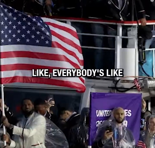 “我干脆直接穿过了那个标志,因为它背后写的是法文,我又看不懂。后来我发现它前面写的是美利坚合众国,我心想他们不需要看这个,他们看詹姆斯和高芙挥旗子就够了。结果我的电话被打爆了,他们说我怎么能站在那个牌子前面,我心想这有什么要紧的?”